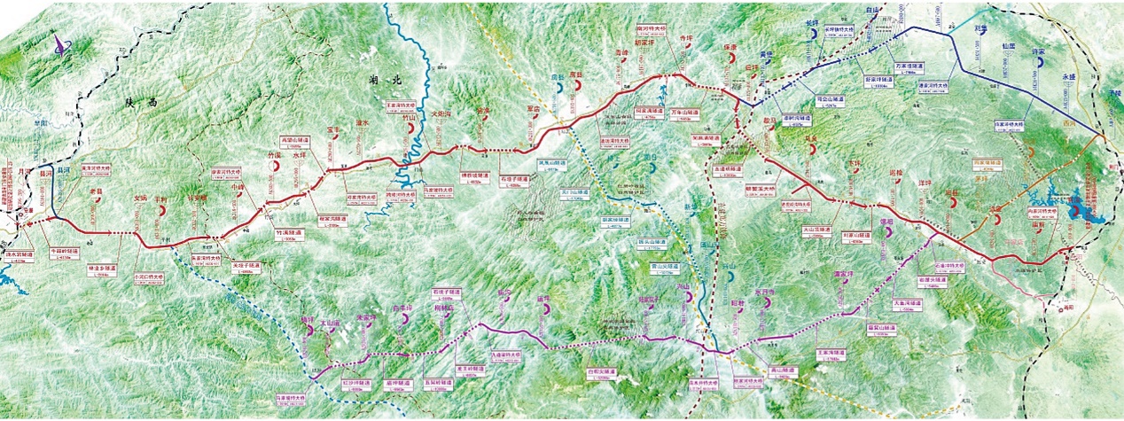 荊門至安康鐵路起自焦柳鐵路的當陽(淯溪)站,經遠安、???、房縣、竹山、竹溪、利縣,終至安康樞紐襄渝線的月河站,線 路全長約為396.28km (其中橋梁全長80.48km,隧道全長176.78km,橋隧總長257.26km,橋隧比64.92%)。為國家I級鐵路,估算總額221.05億元。